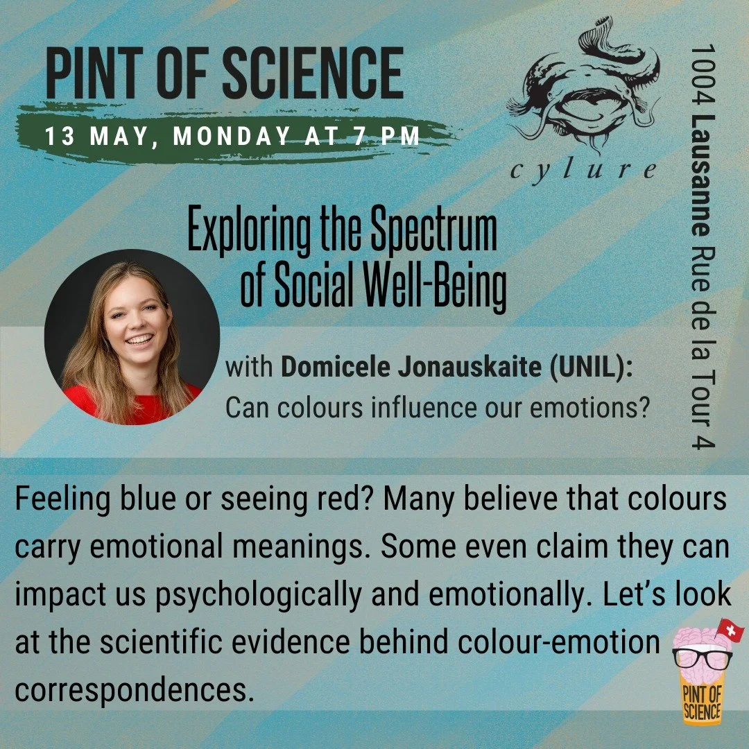 On this occasion, Domicele Jonauskaite will be giving a talk entitled Can colours influence our emotions? Her talk is part of the cycle Color, Language and Sport: Exploring the spectrum of social-well being. Domicele will present the most recent advances in affective colour psychology and hot future directions. The other two talks that evening will concern Language and Sport and will be presented by Sarah Saneei who will talk about how social media affects language, and by Carole Gomez who will be talking about gender-based violence in sports.